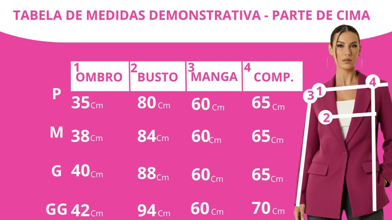 O Blazer Blaze é a escolha perfeita para quem busca elegância e versatilidade em um só produto. Disponível em tamanhos que vão do P ao GG, ele atende a diferentes tipos de corpo com conforto e estilo. Com opções de cores clássicas como Preto, Branco, Off White e Nude, além do vibrante Fúcsia, você encontrará a tonalidade ideal para compor looks sofisticados e atuais.