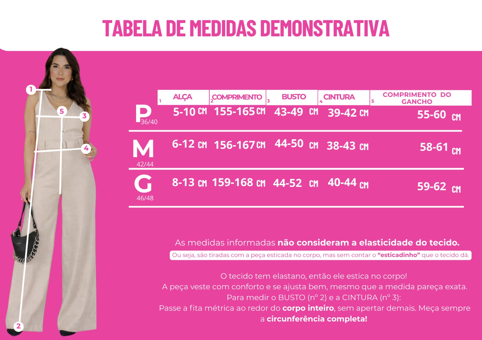 Disponível nos tamanhos P, M e G, o Macacão Milena oferece um ajuste perfeito para diferentes tipos de corpo, garantindo conforto e liberdade de movimento.